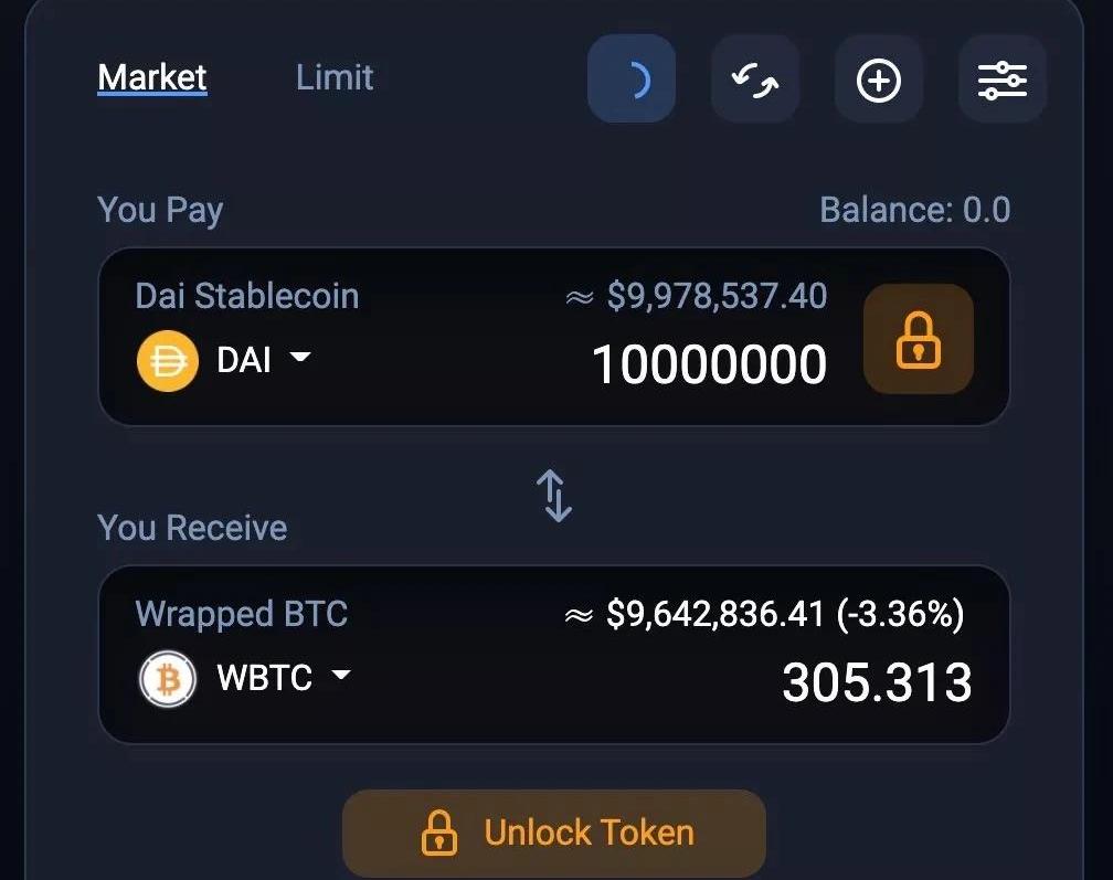 跨资产兑换交易的特点:很低的滑点对于大额兑换来说,使用Curve的跨资产兑换是非常有利的,因为它的滑点很低。下面,通过实际操作来对比一下Curve、Uniswap和1inch.exchange的大额兑换。假设用100万DAI和1000万DAI兑换wBTC,在三个DEX的对比如下: