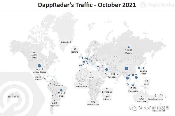 自10月1日以来,超过110万用户连接到DappRadar。美国继续保持前几个月的主导地位,仍然是吸引最多用户的地区。根据11月份的数据,预计来自美国的流量将每月增长8%。