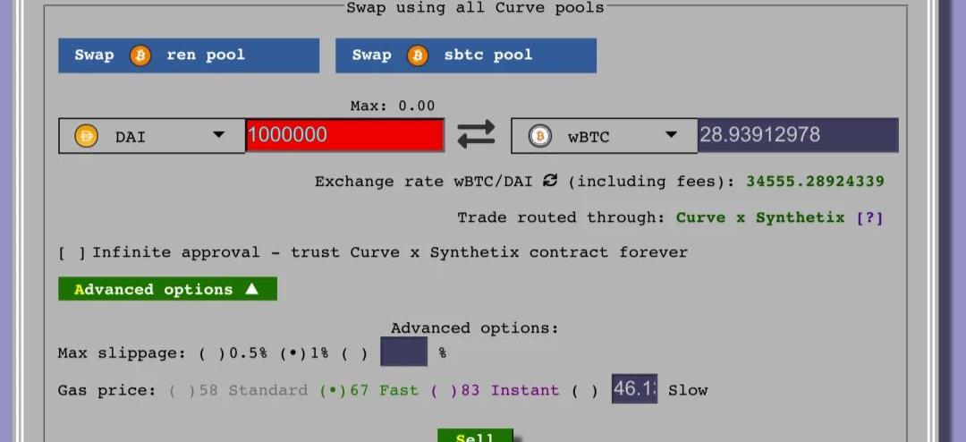 根据Curve的文档所述,跨资产交易将Synthetix作为中间件,其有如下特点:借助于Synthetix的无滑点交易合成资产的功能,大幅降低滑点,上文中我们也见到了这一特点;结算期较长,大约为六分钟,因为Synthetix需要结算期,在结算期内,如果遇到BTC等价格大幅变动的情况,也会造成资产变化借助于虚拟资产,这一跨资产交易功能可以更广泛使用交易费高昂,即便是gas费设置为50gwei,由于交易过程复杂,也需要消耗超多gas,大约花费为80多美元需要分为两笔操作:交易发起与交易清算。例如,将DAI兑换为renBTC(BTC的一种锚定币),会涉及到如下过程:通过Curve,DAI会转换为sUSD这一Synthetix上的合成美元虚拟资产;通过Synthetix,将sUSD无滑点兑换为sBTC,会有6分钟左右的结算期,在此期间最好不要关闭浏览器;这时,用户可以得到ERC721格式的NFT一枚,代表了此次交易;