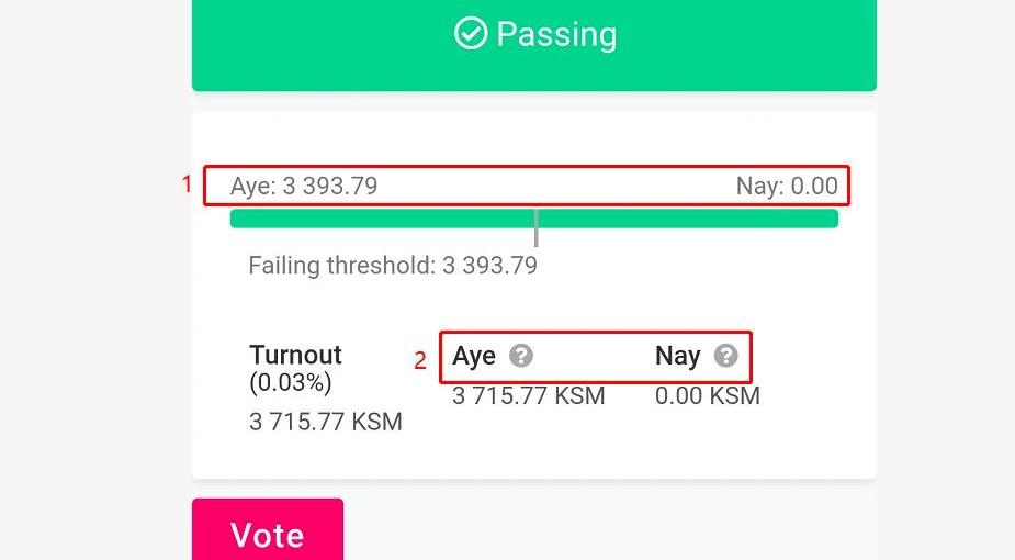 点击这个议案,会跳转到新的页面,如下图所示。其中1代表目前的支持反对票,与上图一致;进度条下面的Passingthreshold会根据投票进度动态调整,同意票数超过这个阈值,议案就会显示“将会通过”;2中“Aye与Nay”代表真实参与投票的KSM代币数量,因为有的票是通过延长锁定获得的,所以真是票数要大于实际锁定的代币数量。