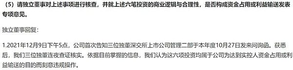 独董回复称:“2月9日下午5点,公司首次告知三位独董深交所上市公司管理二部于本年度10月27日发来问询函。获悉后,我们三位独董连夜查证核实。依据目前掌握的信息,我们认为这六项投资均属于公司为达到实控人资金占用或利益输送的目的而刻意违规操作。”