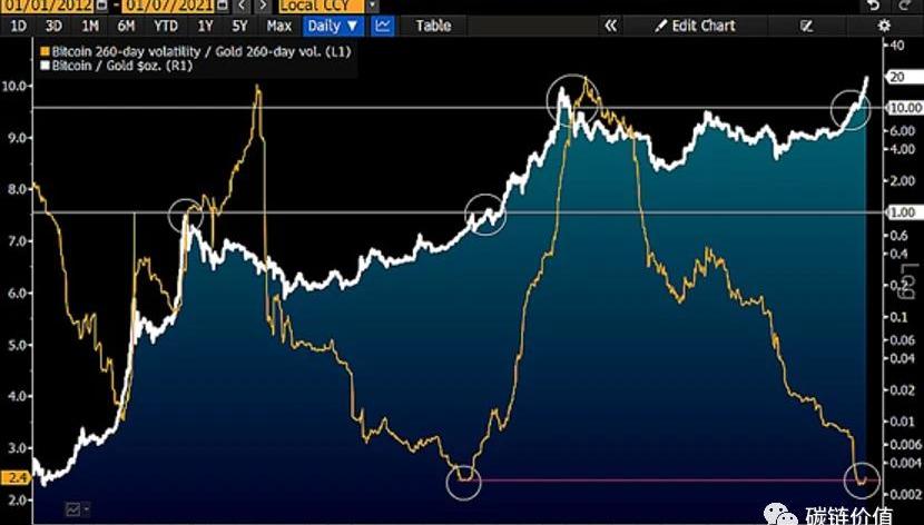 2021年初,相对于股票市场,比特币年度波动衡量指标创下有史以来的最低水平,如果早期模式保持不变,比特币优势将会维持的更久,因为比特币的供应量和波动性会一直下降。表现可能会好过道琼斯,比特币价格可能会「加个零」。相对于股市,比特币已经从低点恢复过来,如果过去的周期性模式在2021年重演,意味着比特币今年会有更出色的表现。从BloombergIntelligence分析图表中可以看出,与道琼斯价格指数走势相比,比特币年度波动率已经降到最低。