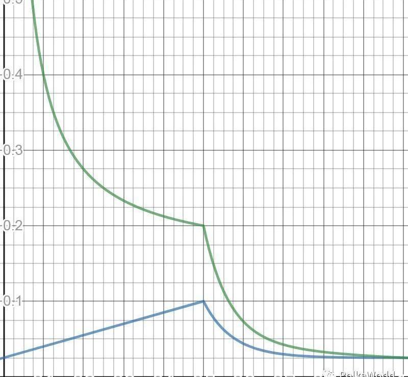 作为持币者,当前可预见的获益方式主要是:staking收益,目前是8%左右;支持项目方竞拍插槽获得项目方token空投等福利。平行链推出之后,持币者将面临二者择其一的决策,因为参与stkaing的token不能同时参与插槽竞拍,反之亦然。Staking的token解冻期是28天,参与插槽竞拍的token则必须等到插槽租用期到期后才能解锁赎回。当前披露的插槽竞拍期包括6个月、12个月、18个月、24个月四种,竞拍者可以根据自身需要选择要租用的时间段。因此,持币者需要注意的第一个点就是两者的解冻期一个是不固定,自己可以任何时候申请解冻赎回;一个是固定期,必须等到到期之后才能赎回。从持币者收益的角度来看,staking与插槽竞拍必将面临直接的竞争博弈关系。当前网络的质押率约为74%,对应的年化收益8%左右。波卡采用了非线性通胀模型,当质押率超过50%,质押收益率将出现明显的下降。如图所示: