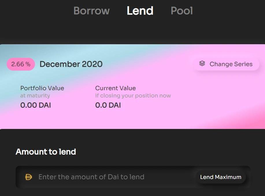 yfDAI和DAI之间是有折价的,比如0.97:1,这其中的折价就是用户借款所支付的利息。在Lend界面用户可以存入DAI来折价获得的yfDAI,折价部分就是到期收益率,购买时可以选择不同的期限,不同的期限收益率不同。到期之后可以使用yfDAI1:1兑回DAI。