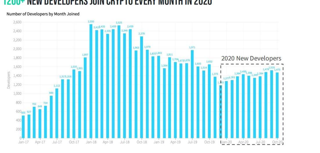 2020年每月有超过1200名新开发者加入了加密领域;在过去的90天里,又45%的新开者保持活跃;从2020年初开始,加密领域的活跃开发者保持在每月40%左右,而当前这些活跃的开发者中,有80%是从2017年之后才开始加入到活跃开发者队伍中来的。