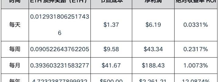 对于单个验证人而言,假设质押金额是32ETH,预计在线时间为99%,ETH价格不增长维持在584.6USDT,运行节点的成本为500USDT/年,那么该节点的收益估算如下: