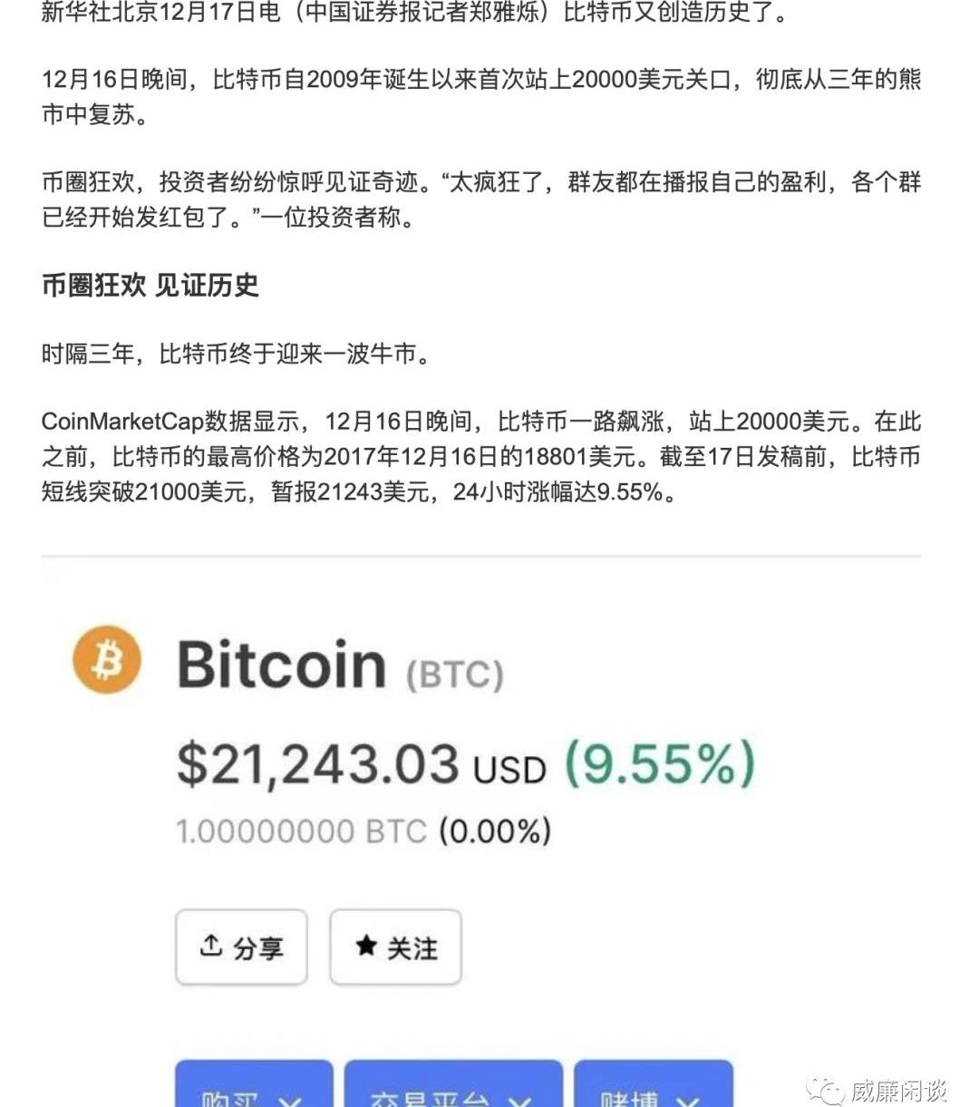 不过我昨天的文章写了,真的不能当“废人”,可能很多人都很期待能过上废人般的生活,但是对于我来说,还是希望能继续写点儿东西,搞点儿动静的,闲不住。所以尽管昨天到了很晚,但是我还是摆脱了废人的无力,起来写了这篇文章,已经快十点了。昨天真是非常少见的从各路媒体齐上阵,而且都是比较正面地评价“比特币新高”这件事情,而不带着“区块链”这个词了。除开我们熟悉的主流财经媒体之外,甚至新华社和“侠客岛”这类官媒都有所报道。