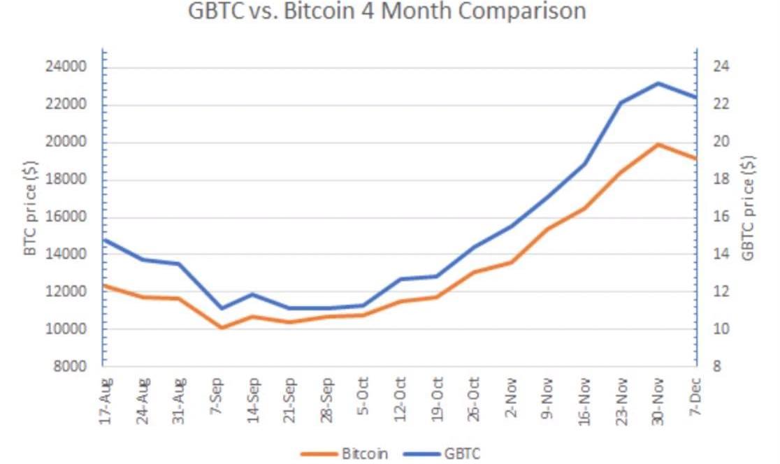 比特币上一次经历抛物线式上涨是在2017年,当时ASIC芯片和其他挖矿硬件短缺,而AMD、Nvidia和比特大陆等供应商无法满足需求。如果比特大陆和MicroBT再次发生这种情况,那么当前拥有下一代设备的任何矿工都将拥有优势,直到更多的硬件参与其中。相反,如果黄金价格翻番至每盎司4,000美元,则黄金勘探工作将增加,矿工们挖取黄金的速度也将增加。反过来,这将使供需达到平衡,如果供应超过需求,则金价就会降低。但对于比特币而言,无论挖矿硬件军备竞赛持续多久,比特币的挖矿速度都不能超过每大约10分钟6.25BTC,这要归功于中本聪在协议中内置的供应计划和难度调整方案,这严重影响了比特币的供需动态。4、GBTC与比特币