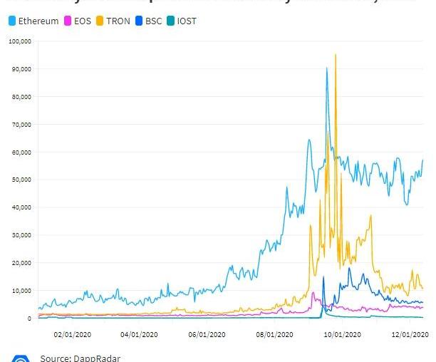 该报告指出,全年资金一直从比特币流向ETH,导致ETH对BTC的汇率一直在上涨。具体表现为从1月1日的1:0.018个比特币上涨到目前的1:0.028。DappRadar推测,DeFi有吸引力的收益率是「比特币流向以太坊的主要触发因素」,而wBTC和RenVM的renBTC在利用比特币巨大的流动性储备为DApps提供资金方面发挥了关键作用。报告将2020年描述为「Dapp试图不惜一切代价增长的一年」。数据显示,仅10个Dapp就占以太坊总交易量的87%。这10个Dapp在11月份的活跃用户总数超过了100万,其中排名前三的DeFiSwap(Crypto.com)、Uniswap和Compound以93万的活跃用户占主导地位。该报告指出,以太坊的局限性在今年变得明显,因为以太坊网络「在可扩展性方面实际上遇到了瓶颈」,平价Gas费比去年高出几倍。今年下半年,网络拥堵加速了竞争对手的崛起,像币安智能链、波场和Wax等支持DApp的平台在DApp总交易价值中所占份额迅速上升。其中波场是第一个在发展DeFi生态系统方面赶超以太坊的区块链。迄今为止,波场网络上已有70多个Dapp。大多数活动集中在前三名的Dapp中。USWAP,JustSwap和UME每天生成5,000多个活跃钱包,占其DeFi生态系统活动总量的70%。币安智能链是另一种迅速发展起来的协议,在正式上线后的几个月内就产生了约30亿美元的交易量。尽管与以太坊的年度交易量相比仍然是一个相对较小的数字,但这个交易量已逼近波场的36亿美元年度交易额和EOS65亿美元的交易额。