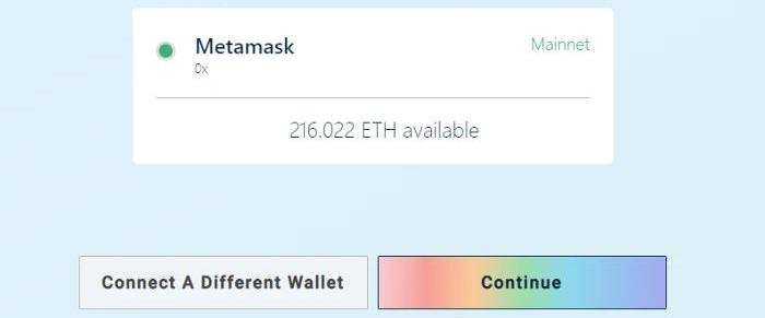 连接你的钱包。选择MetaMask(或者是其他支持的钱包),登录,选择存有你的ETH的钱包,然后点击Continue。你的MetaMask余额就会显示出来。如果你选择了主网且你有充足的ETH余额,网站会允许你继续下一步。