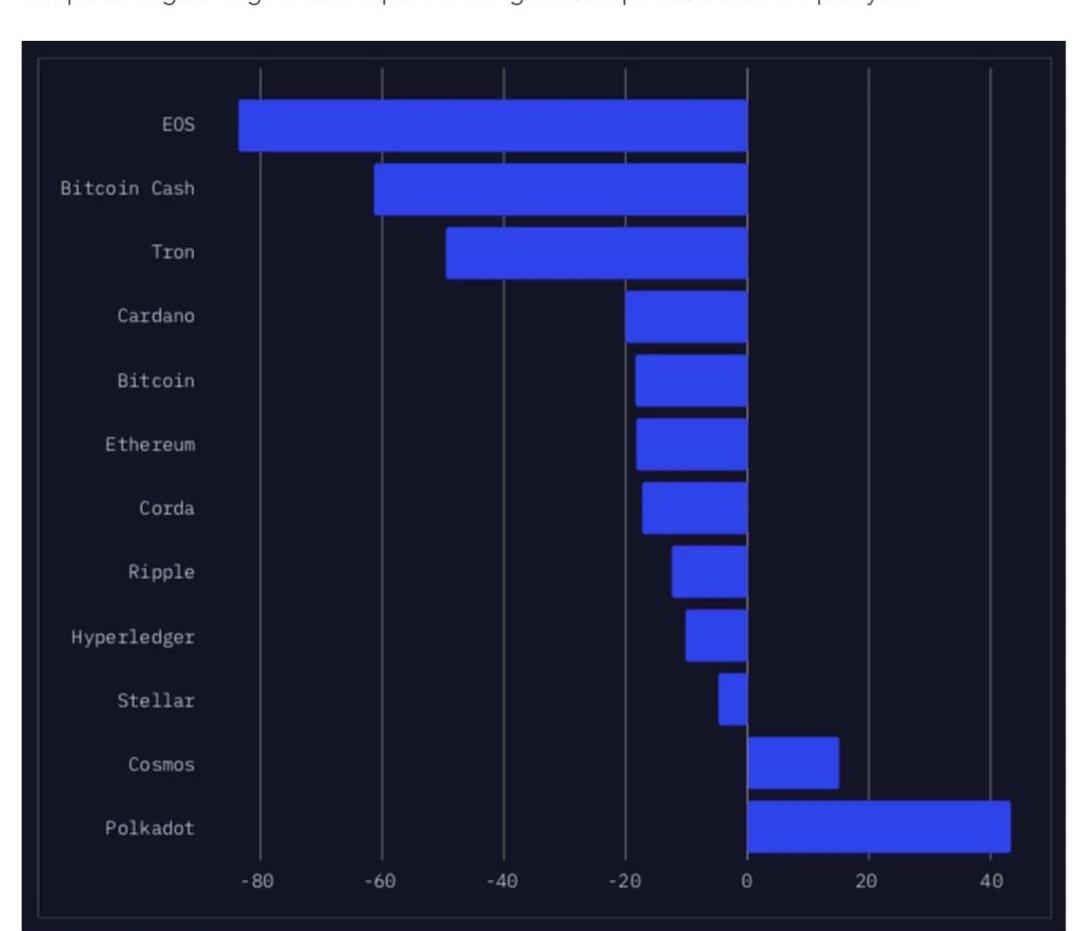 各区块链上开发者数量变化此外,虽然平行链插槽还未进行拍卖,整个波卡网络还没有运行平行链,平行链间还没有交互,但是Subscan数据显示,主网平均日活已经达到2000左右,每日交易笔数稳定在2000-4000笔,网络选出的验证人数量已经达到229个。在融资和生态应用支持方面,波卡的动作也很多。波卡总共经过9轮融资,共融资1.837亿美元,融得的资金,有一部分用到了对生态应用的支持上。截止今年3月,Web3基金会宣布,已经对100个开源项目提供了价值近500万美元的资助,虽然资助力度较小,但是项目覆盖面广,资助项目多,远超EOS等公链。以今年前两个季度为例,Q1平均每3天新增一个资助项目,Q2平均每4天新增一个资助项目。