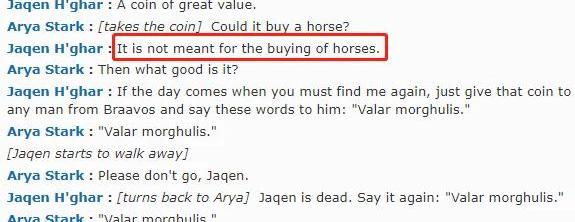 简单翻译理解为:二丫不理解这个币的价值,所以问贾根:我能用这个币买马吗?大叔说,这不是让你买马的。这是一个可以让你找到我的通证,你只需要拿着这个币告诉别人一句话“挖那门头沟历史”。然后对方就知道你是个有身份的人,你就可以得到帮助了。二丫就带着这个币,开启了布拉佛斯之旅,在黑白学院经历了残酷严格的训练,而后道士下山,为父母报仇,辅佐哥哥姐姐成就霸业,并亲手杀死北方游牧民族首领,成为《权力的游戏》扭转战局的关键人物。这就是二丫在拥有了币之后的人生。这个币和比特币非常接近