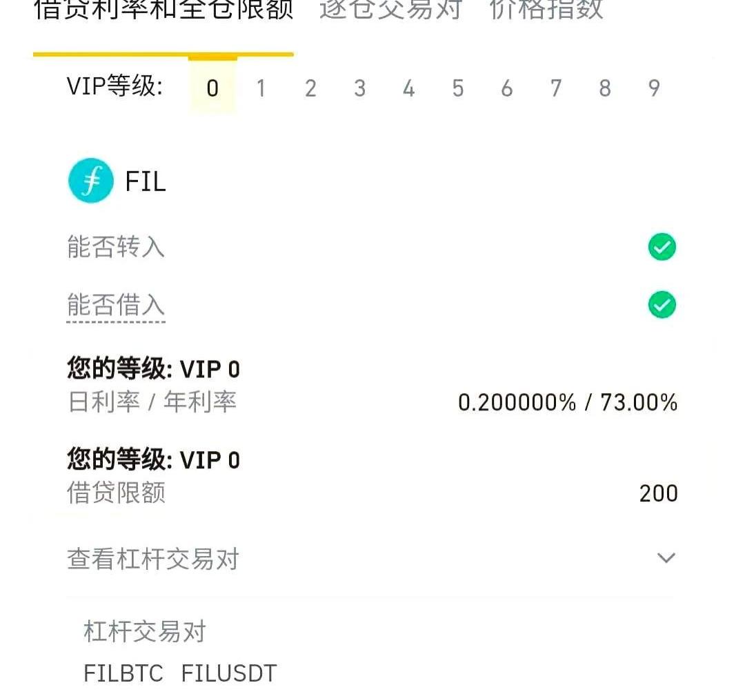 火币逐仓杠杆产品页币安上年化利息较高,可达73%,质押率根据此前了解需低于66%,如用户在平台的等级较低,则还有借贷限额。