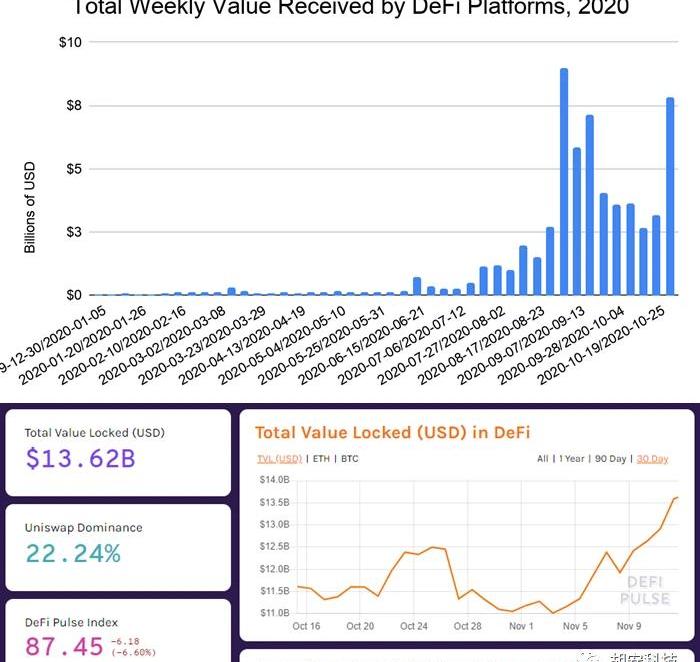 DeFi的爆炸式增长,今年加密领域最瞩目的焦点之一。DeFi协议捕获的总价值在整个一年中都有大幅增长,尽管9-10月中旬总体略有下降,但每周数据显示,该活动从10月底开始再次回升,截止今日11月12日,总锁仓量已经突破了130亿美元。