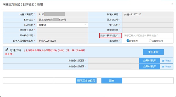 (二)步骤二:输入16位数字人民币钱包ID,系统会自动带出银行行别、银行营业网点、清算银行号、开户银行行号。数字人民币钱包名称默认为纳税人名称、且不可修改,如实际数字人民币钱包名称与纳税人名称不一致,将无法签订三方协议。