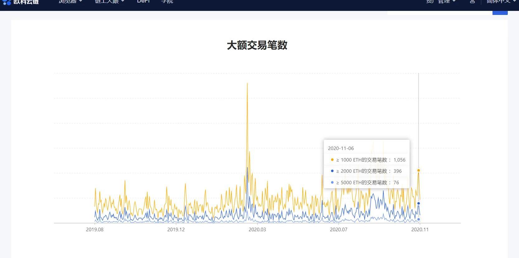本月6日以太坊上金额大于1000ETH的大额转账达到1056笔,是近期的高位。而当日以太坊的链上交易量同样达到422.1万,是DeFi狂热以来的新高。交易手续费