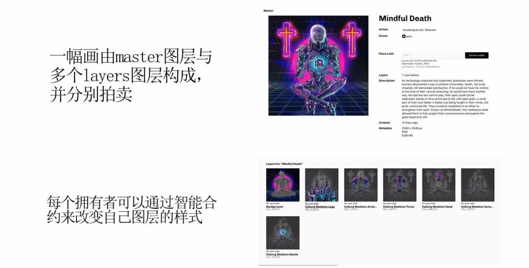 加密艺术的信息科学语境加密艺术跟其他艺术形式不一样,它有天然的信息科学语境。有了区块链技术这么一个综合了数学、信息科学等等学科的技术之后,才能有加密艺术,所以加密艺术最大特点之一当然是可编程。所以这件艺术作品它是由master图层和多个图层来构成,并且每个图层会被分别拍卖,每一个图层拥有者可以通过智能合约来改变图层样式,当然这个master图层也会随时进行改变。