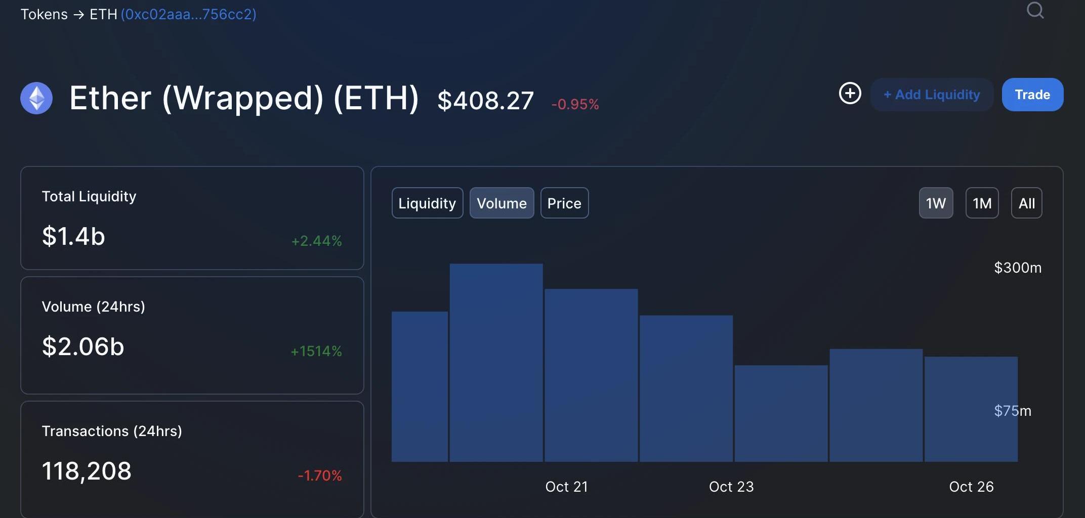 黑客从Curve转移USDT之后,其中一部分通过Uniswap将其转换为renBTC,向比特币区块链迁移。首次攻击影响,Uniswap平台今日交易量暴涨超过1200%,24小时交易量达到20.08亿美元,其中ETH相关交易规模占到20.06亿美元,24小时涨幅1514%。