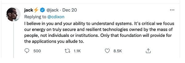 在回复A16Z的时候Jack Dorsey就表示,真正去中心化的基石是要通过技术确保选择的权利在大多数人的手上,而不是在某些个体和机构手中。他也在之后的各种发文中强调,他针对的是这些打着Web 3旗号想去挣一波快钱VC们,而不是那些为实现去中心化网络而努力的人们。