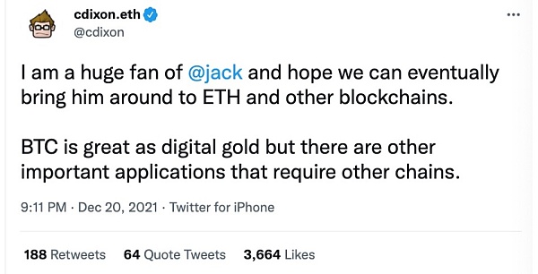 A16Z的合伙人 Chris Dixon继搬出名人名言、心灵鸡汤之后,又接连发文澄清“在Web3中,所有代码、数据和所有权都是开源的,风投机构(包括a16z)拥有的很少。”最后,他还公开“表白”Jack Dorsey,表示自己是他的粉丝,喊话他在信仰比特币的同时也能以包容的心态接纳Web 3。