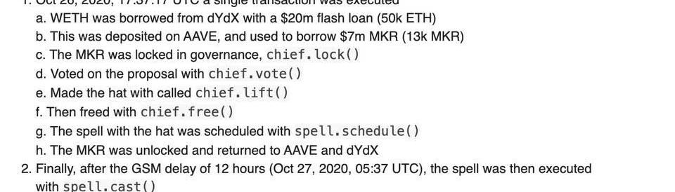 闪电贷攻击的存在引人不安,尤其是在处于混沌状态的加密早期阶段,DeFi协议可组合性的加持,DeFi中的用户犹如在危机四伏的黑暗森林中探险,如履薄冰,在高回报和高收益的表象下,闪电贷攻击隐藏着杀机四伏的安全风险。然而,这还不是全部。最近,闪电贷又被发现有了新的「用武之地」,即可被用来操作选票进行去中心化社区治理攻击。本周早些时候MakerDAO通过的一起治理投票,事后被发现该治理流程中有利用闪电贷操纵进行投票。虽然事后调查显示,此次事件并非出于恶意,但这起事故让MakerDAO社区意识到,闪电贷在治理结构中存在着隐形操作风险,且具有可操作性。具体来说,10月26日,Maker基金会智能合约开发团队检测到一起发生在MakerDAO治理提案中的投票违规行为,该提案由DeFi流动性协议BProtocol开发团队发起,主要目标是提议将BProtocol列入到MakerDAO预言机的白名单中,以获得访问MakerDAO价格预言机的权限,此次检测发现该提案使用了闪电贷功能操纵投票以通过提案。事后监测发现,此次提案投票过程中,有多个步骤的操纵被创建和执行,具体来说,首先从dYdX通过闪电贷借出WETH,接着将其用作抵押资产从借贷平台AAVE中借出价值700万美元的MKR代币,之后借出的大约1.3万MKR代币被用于进行该提案投票,投票完毕后将其返还。