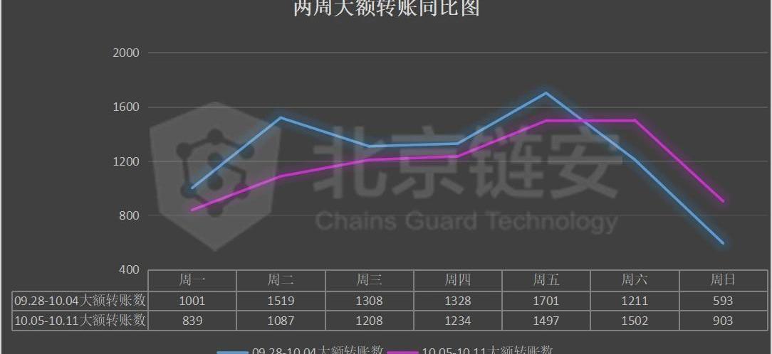 大额转账数:09.28-10.04:866110.05-10.11:8270较之前一周下降:4.51%详细数据图如下: