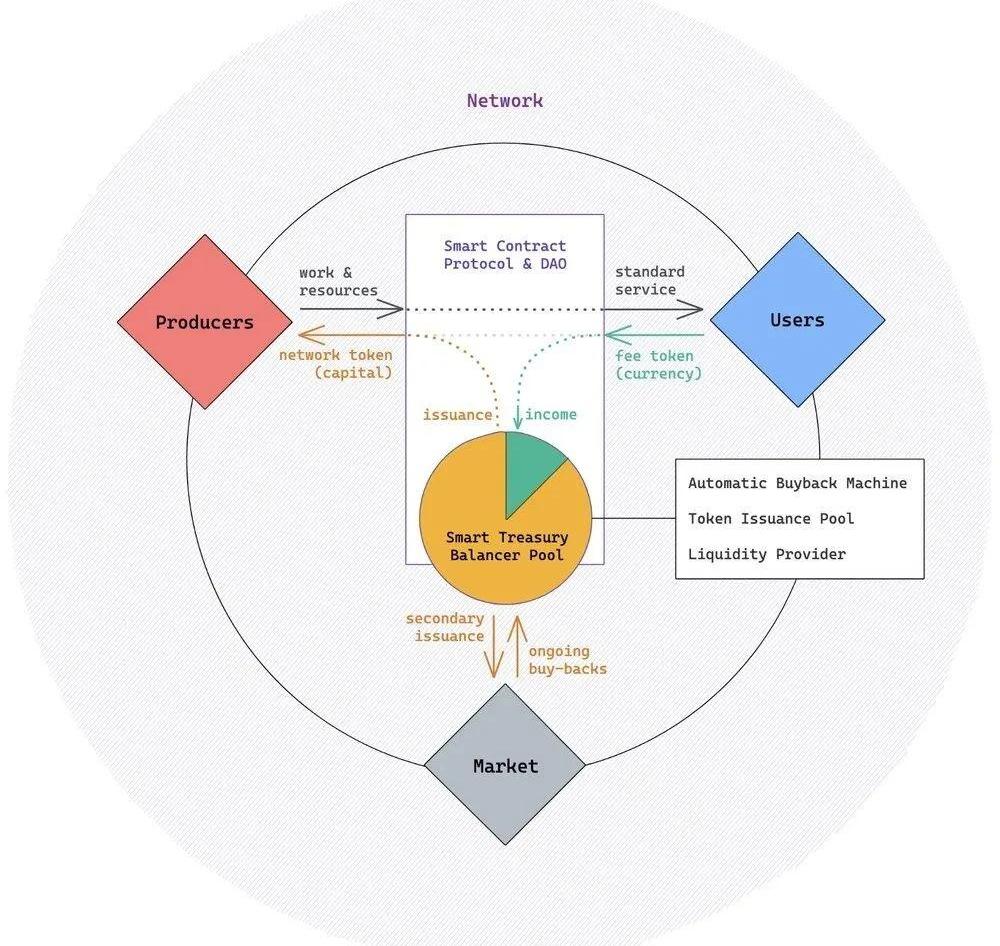 这个设置跟“密码经济循环”很相似。协议/DAO智能合约负责协调生产并调节生产性资本和金融资本在生产者和消费者之间的交换。生产者提供工作量和资源来换取资本品代币,交换规则由增发协议规定。用户消费网络的服务,并使用指定的通货或者手续费代币来支付。我们加入一个用Balancer池子实现的“智能仓库”,由协议/DAO合约来控制这个池子。我们先假设,整个网络获得ETH形式的收入,而原生代币叫TKN。Balancer是一个可编程的流动性协议和去中心化交易所。简单来说,你可以创造一个至多包含8种代币的指数化的篮子。你可以根据自己的需要选择指数,在我们这个例子中,我们设成10%的ETH和90%的TKN。我们还把这个池子设置成持有控制者才能从池中增加和移除流动性。再假设我们铸出了供给量上限为1千万的TKN,并加入一些ETH存进了这个池子。那么这一套新的Balancer仓库就可以做很多事情了:1.自动化的回购机制。存入所有的ETH收入到仓库池。只要仓库中的ETH价值高于指数价格的10%,Balancer池子就会自动通过卖出过量的ETH、在公开市场上买入TKN,直至恢复90/10的指数。因为我们池子中仅有的另一种代币就是TKN,恢复平衡的唯一办法就是从市场上买入TKN。如果市场上没有卖家,池子会自动为TKN报出更高的价格。因为我们的池子是由网络来持有的,这个过程就等价于回购——对TKN的价格也有同样的积极作用。随着收入流入网络并转移到智能仓库,回购实时地发生,并且由Balancer协议来自动管理。这样做高效得多,不仅仅因为它免去了开发者维护复杂的回购-销毁代码的必要,还免去了对特殊的“keeper”机器人的需要、免去了设计流通性提供者激励机制的必要。Balancer市场上已有的套利者免费且实时地提供了这些服务,大幅度简化了协议。2.代币发行池。协议可以在资本投入网络时发行新的代币,或者在特定事件中铸出特定数量的代币然后根据增发方案来分发。我们这里的模型使用预先铸出代币的方法,然后从一开始就把要分发的数量存到智能仓库中。因为只有协议合约能从池子中加入和移除流动性,网络可以从智能仓库中取回资金来筹措激励机制所需的TKN。另一点跟其它模式一样的是,网络的发行模式可以由一个智能合约来执行。彩蛋:回购操作的反向操作也让智能仓库可以变成一个自动化的注资机器。就像添加ETH到池子中会触发一个自动化的回购,取回通货也跟从仓库中释放TKN并在市场上卖出、换回通货,有一模一样的经济效果。这一功能可用于在必要时持续地筹措资金用于支出。举个例子,一个DAO可以取回通货来支付开发资金,或者一个协议可以使用仓库中的手续费代币月作为一种以网络代币来背书的“保险资金”。这个功能对于那些使用自己的代币作为最终偿付保险的协议来说是非常有用的,但它同样不需要特殊的看护人和拍卖机制来保证代币铸出后是按合适的市场价格来出售的——Balancer就免费提供了这部分保证。3.流动性提供者。最终,我们的智能仓库也可以变成一个流动性提供者。因为我们的Balancer池中的资产,也可以通过其去中心化交易所来兑换,这就意味着TKN的买家和卖家都能获得流动性保证,因为他们总是可以跟协议本身作交易——而且代币持有者也对这些交易的经济价值有把握。Balancer让我们能定制化资金池的各种参数,调整所提供的流动性。比如:Balancer的池子最多能存入8种资产。在我们这个例子中,我们只有TKN和ETH。但如果你的网络支持多种代币作为支付手段,你也可以通过其它代币来增加和移除TKN的流动性,只要改变权重即可。比如你可以把80%的TKN、10%ETH和10%Dai做成一个池子,然后不论什么收入都存到池子中。这也意味着你可以维护TKN的多种代币对的流动性。Balancer的关键创造就是它可以维持一个指数篮子。在我们的案例中,这个功能让我们可以创建一个由80~90%的TKN和10~20%的通货代币组成的资金池。但你可以很容易把这个比例改成任意你想要的权重。会受到影响的只是池中TKN的整体流动性。一般而言,更高比例的TKN会导致其交换价格的滑点提高,也就是让TKN的价格变动的敏感度提高,导致交易变得更加昂贵。我们可以为资金池设计收取最高达10%的交易手续费,因此补贴我们的仓库。这是的我们可以编程代币在买卖时的溢价。改变交易手续费率也可以改变仓库资金池在交易市场上的竞争力。如果你想要遏制买方、保护协议的TKN余额,你可以设定一个更高的手续费率。这些参数可以一次设定之后就永久固定下来,也可以通过智能合约来编程,或者通过一个DAO投票机制来更新,只要网络自身有需要。本质上,你其实是在编程网络给市场提供多少流动性。你想创建越多的流动性,就要让对仓库的交易变得越便宜——比如可以通过提高通货代币在池中的比例来降低资本品代币的价格滑点,也可以调低交易手续费率。如果你想让网络自身变成保证最终偿付的流动性提供者——也就是人们可以买入和卖出TKN的最终保证——你就提高交易手续费率和滑点。能够通过DAO来改变设定,也使得网络可以因应市场情形的变化来改变代币的经济模式。举个例子,在牛市的时候,提高仓库中的TKN余额和手续费率会好一些,因为能够让仓库加速积累TKN。在熊市中,TKN的流动性对网络健康来说更重要,所以,降低交易手续费会好一些。这一切跟中央银行管理经