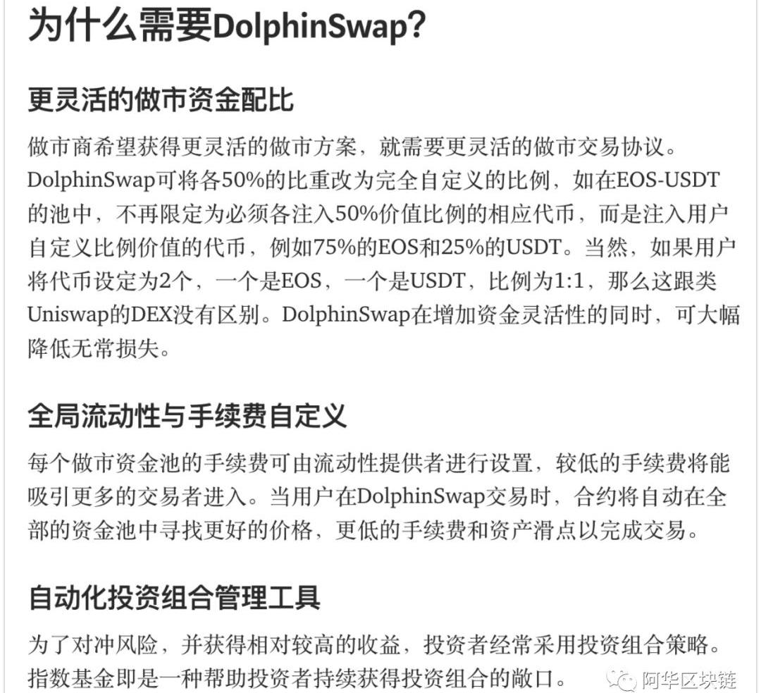 目前无论是大宝还是大丰收,做市的资金市值占比都50%:50%,也就是做市的资金对中投入的两种资产的市值是一样的,这是基于恒定乘积的模式,在未来的EOSDeFi产品中,做市的资金占比用户将可以进行自定义,而且加入的做市资产也不再局限于两种代币了,而是可以同时往资金池中投入更多代币。例如DolphinSwap的资金池最多支持8种代币。不但可以加入多种资产到资金池中,而且做为做市商,手续费也是可以进行自定义的,而钻石团队的海豚交易所就是一个专注于这方面业务的N维自动化做市协议。根据白皮书的内容所述,DolphinSwap是一个N维自动化做市协议,DolphinSwap做市资金池最多支持8个币种,并将允许你自定义每个代币的占比和资金池手续费,是一种通用化的去中心化交易所。