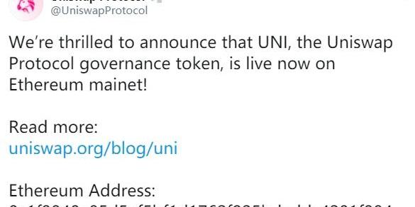 9月17日,Uniswap推特发布消息称,其协议管理代币UNI现已在以太坊主网上发布。