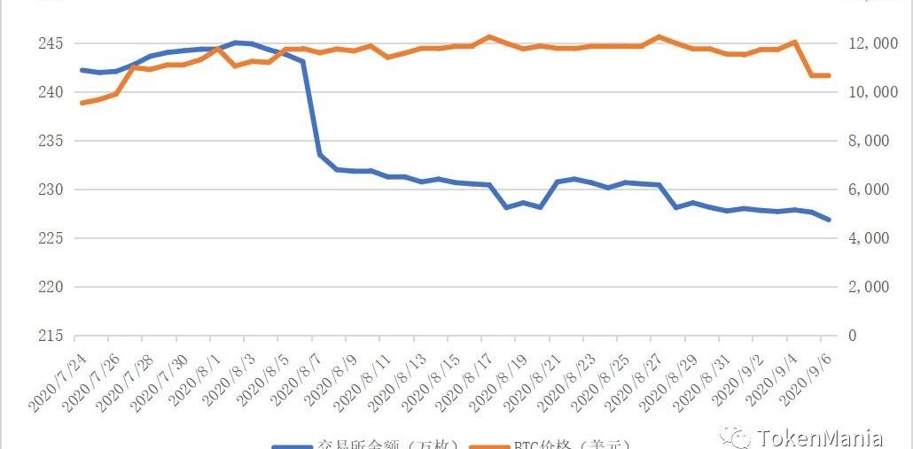 资料来源:CoinMarketCap,TokenMania本周累计换手率排名前三位的分别是EOS的每日平均值。4.交易所钱包余额:BTC余额减少0.76%本周交易所BTC钱包余额226.8353万BTC,较上周同期减少0.76%;交易所USDT余额54.8038亿USDT。当前USDT流通总量为101.5334亿美元。图10近期交易所BTC余额与BTC价格走势