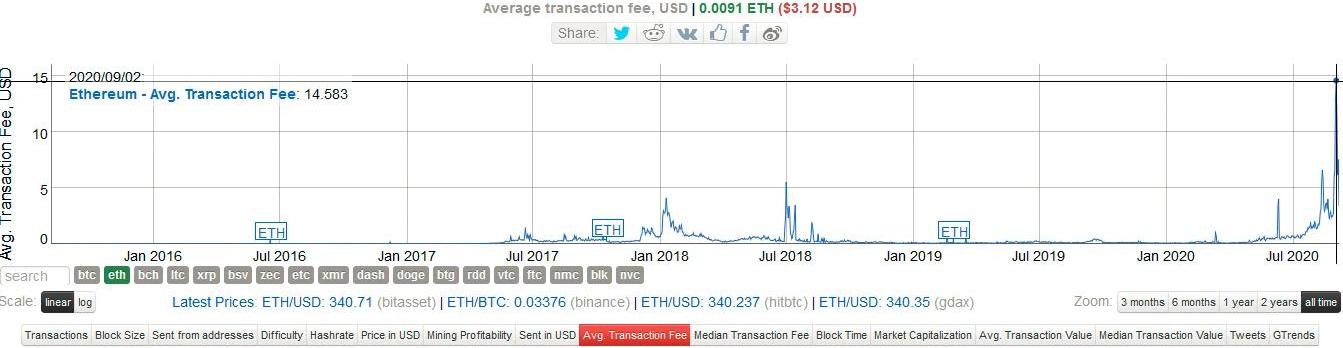 我们知道,ETH是所有DeFi项目流动池中最为主要的基础资产。以Uniswap为例,质押资产价值最高达到15.6亿美元,其中ETH达到7.6亿美金,占资产池总量的一半。在DeFi锁仓量最大时资产价值为95亿美元,其中有31亿美元为以太坊,相比之下比特币只有7亿美元。一般会认为,以太坊被质押后,流动性会变弱,实际上并不是这样的。9月1日的SushiSwap的质押流动性挖矿,直接促使以太坊Gas费飙涨,超过400Gwei,24小时全网交易笔数超过150万,超过18年的历史高点,以太坊价格触及近期最高价480美元。因此,锁仓并不是减少流动性,而是增加了流动性,流动性增加导致以太坊价格飙涨。原因在于,在流动性挖矿中,即便发送一笔交易手续费达到数百美元,依然有人愿意为此支付。