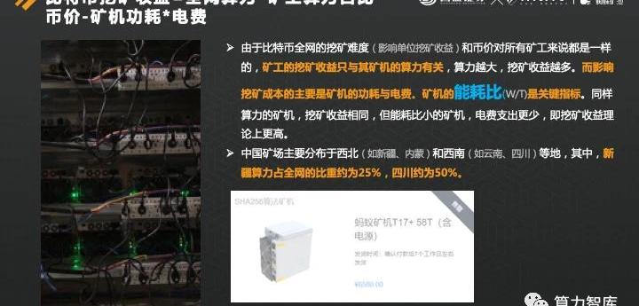 做任何一笔生意,都有收入和成本。那么比特币挖矿的收入和成本分别是什么?宋嘉吉介绍道,从收益概念看,比特币挖矿收益=全网算力*矿工算力占比*币价-矿机功耗*电费。由于比特币全网的挖矿难度和币价对所有矿工来说都是一样的,矿工的挖矿收益只与其矿机的算力有关,算力越大,挖矿收益越多。而影响挖矿成本的主要是矿机的功耗与电费。矿机的能耗比(W/T)是关键指标。同样算力的矿机,挖矿收益相同,但能耗比小的矿机,电费支出更少,即挖矿收益理论上更高。成本端分成固定投资和运营投入两部分。投资者购买矿机相当于在某个时点建立对比特币的看多期权,为什么称之为看多期权?因为购买矿机时看好币价的,不看好便不会购买。投资人按一定的价格购买就相当于一次性投入,即固定资产投资。投资期间的电费、运维、折旧摊销则构成运营成本。