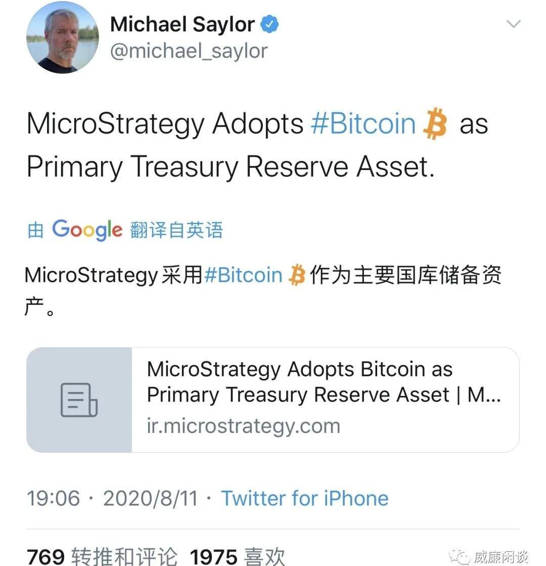 编者按:本文来自威廉闲谈,作者:陳威廉,Odaily星球日报经授权转载。前天出现了一个新闻,不过可能大家都不是很关心,因为..比特币没涨嘛。最近大家都觉着山寨热闹,其实倒也是这样,17年那会儿也没啥人在意比特币,尽管嘴上都说着比特币nb,但是身体都很诚实地去冲山寨了。正常的经历罢了。不过前天这个新闻的确还是很值得关注的,就是美股上市公司Microstrategy买入比特币作为主要资产储备,这是他们公司的公告: