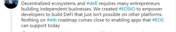 本周大事记 EOS本周靠发推“蹭”DeFi成功拉盘。EOS两位创始人BM和BB上周在自己的推特中不断提及EOS与当下大热的DeFi概念的契合之处,BB称EOS将“解锁”DeFi技能,BM称EOS.