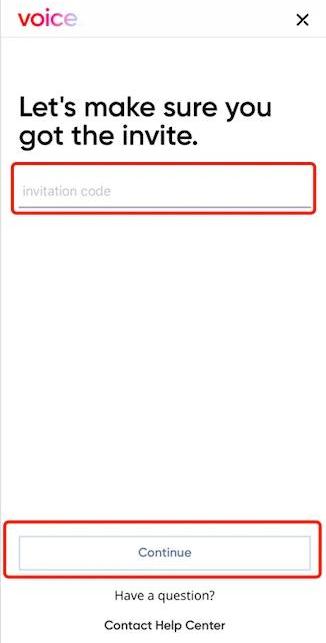 第二步,Voice的注册是邀请制的,就是说只能请已注册用户发送邀请码给我们。你需要提供你的邮箱以及之后注册准备使用的英文名称给已注册的用户,他发送邀请完毕后,在你的邮箱查收邀请码。,收到邀请码后,点击「Ihavemyinvitecode」,填写邀请码,之后点击「Continue」;