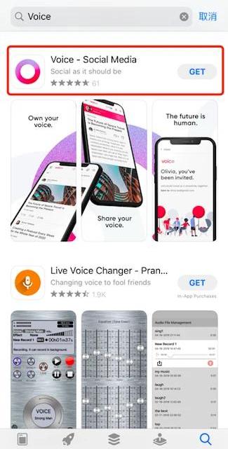 第二步,打开AppStore,搜索Voice,认准下面这个造型的logo,点击「GET」,在按照系统提示正常操作即可下载完成。