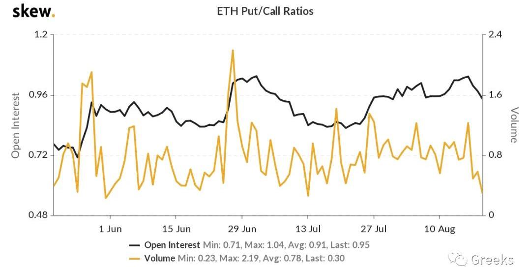 ETH历史波动率10d73%30d83%90d67%1Y101%以太坊今日期权持仓量4.24亿美元。以太坊今天也是横盘,成交量昨天比较大,今天有所下降。各标准化期限IV:今日:1m88%,3m95%,6m90%8/19:1m98%,3m101%,6m96%昨天以太坊的价格没有涨,但是IV却上升了;今天价格回落,IV也有所下降,但是仍处于高位,次月的卖家可能会多起来。