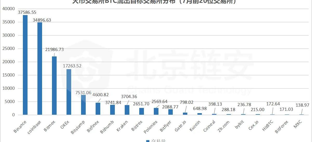 Huobi流出的比特币主要去向中,Binance、coinbase、Bitmex位居前三,币安在火币交易所流出的比特币去向中继续占据第一,相较于6月,火币流向币安的比特币数量上涨了73.90%。