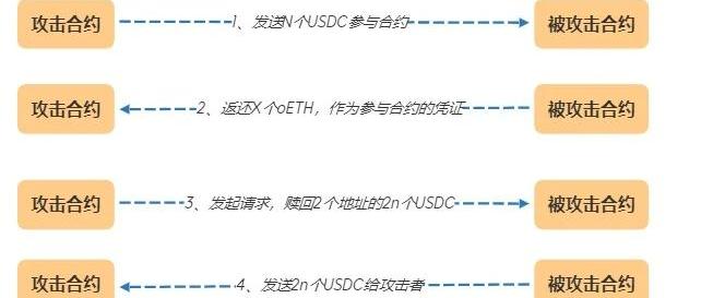 成都链安-安全实验室第一时间对本次事件进行跟踪分析,以下是态势感知系统检测盗的攻击者合约地址:0xe7870231992ab4b1a01814fa0a599115fe94203f0xb837531bf4eb8ebfa3e20948bd14be067c18cbd30xb72e60ea1d0c04605f406c158dce9ac6ae6d224c攻击者攻击方式还原:1、攻击者调用合约向合约发送n个USDC增加抵押,并得到合约币oETH2、攻击者调用合约发送ETH进行抵押,并销毁oETH以赎回自己的USDC3、攻击者赎回自己抵押的ETH。如下图所示: