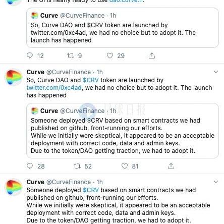 结果是,Curve官方不得不去采用推特用户0xc4ad的CurveDAO和代币。看到这里,很多人可能会有所疑问:为什么CRV能被别人提前部署?这部分被提前挖到的CRV可以正常在市场交易吗?会不会对CRV造成砸盘影响?以及Curve团队为何不重新部署一个合约地址?PeckShield品牌总监郝天告诉Odaily星球日报,Curve代码在部署前已经开源,任何人都可以看到,别有用心的参与者也在其中,攻击者通过观察项目方部署合约的举动,比如,Etherscan或全节点交易池之类的,发现项目方做出了部署合约的举动,攻击者与此同时也部署了一模一样的合约,或以更高的gas部署费抢先部署成功了。在项目方发现部署失败后的时间空档内,攻击者已经疯狂启动了预挖,自然同时也被项目方发现了,项目方于是开始披露出现的状况,并和攻击者协商处理方案。一种处理方案是:项目方和攻击者协商,要求其交出私钥,然后销毁掉预挖的代币,重新宣布启动挖矿;另一种则是:项目方重新部署新合约启动项目,但考虑到项目已有的知名度,这需要一定的其他成本考量。郝天提醒各位投资者,无论如何,目前已经启动的项目合约,官方还没有实际控制权,建议用户务必不要参与,避免资产遭受损失。也有网友认为此事是Curve官方的失职,认为官方没必要认可一个抢跑的合约。但是目前来看,这件事对官方来说是没有什么损失的,这提前被挖出的25万枚CRV只能由之前那些提供流动性的人或者二级市场的买家来买单了。
