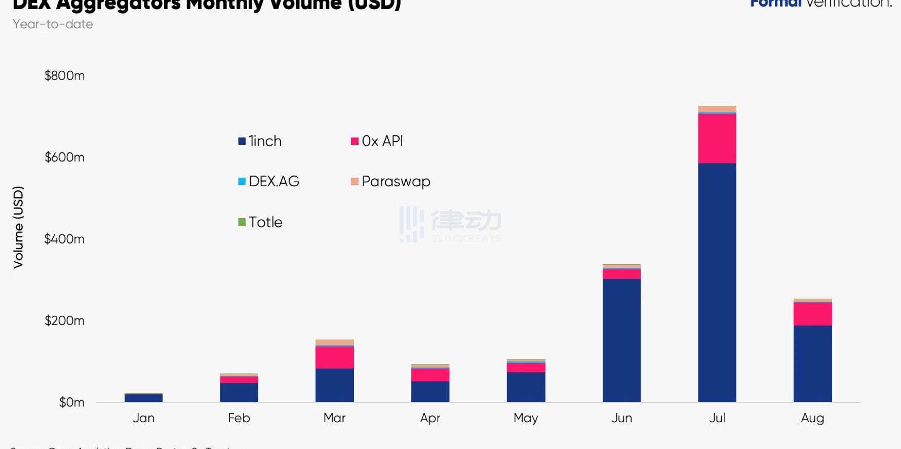 编者按:本文来自区块律动BlockBeats,Odaily星球日报经授权转载。随着DeFi的火热,去中心交易平台的数量急速攀升,DEX聚合交易平台的重要性也随之增加。DEX聚合平台(1inch,0xAPI,DEX.AG,Paraswap,Totle)将各个dex的分散流动性整合到一起,提供了最好的价格,最佳的深度,和清晰简洁的界面。可以被称作DEX玩家的最后一站。DEX聚合平台拥有很多功能,深度聚合,简化智能合约操作。现在这些聚合平台今年的交易量已经剧烈增长了数倍。0x的API在一月上线,通过API可以得到包括0xMesh,Uniswap,和Kyber的订单来作为流动性。6月0x的API交易额就达到了1.2亿美金。