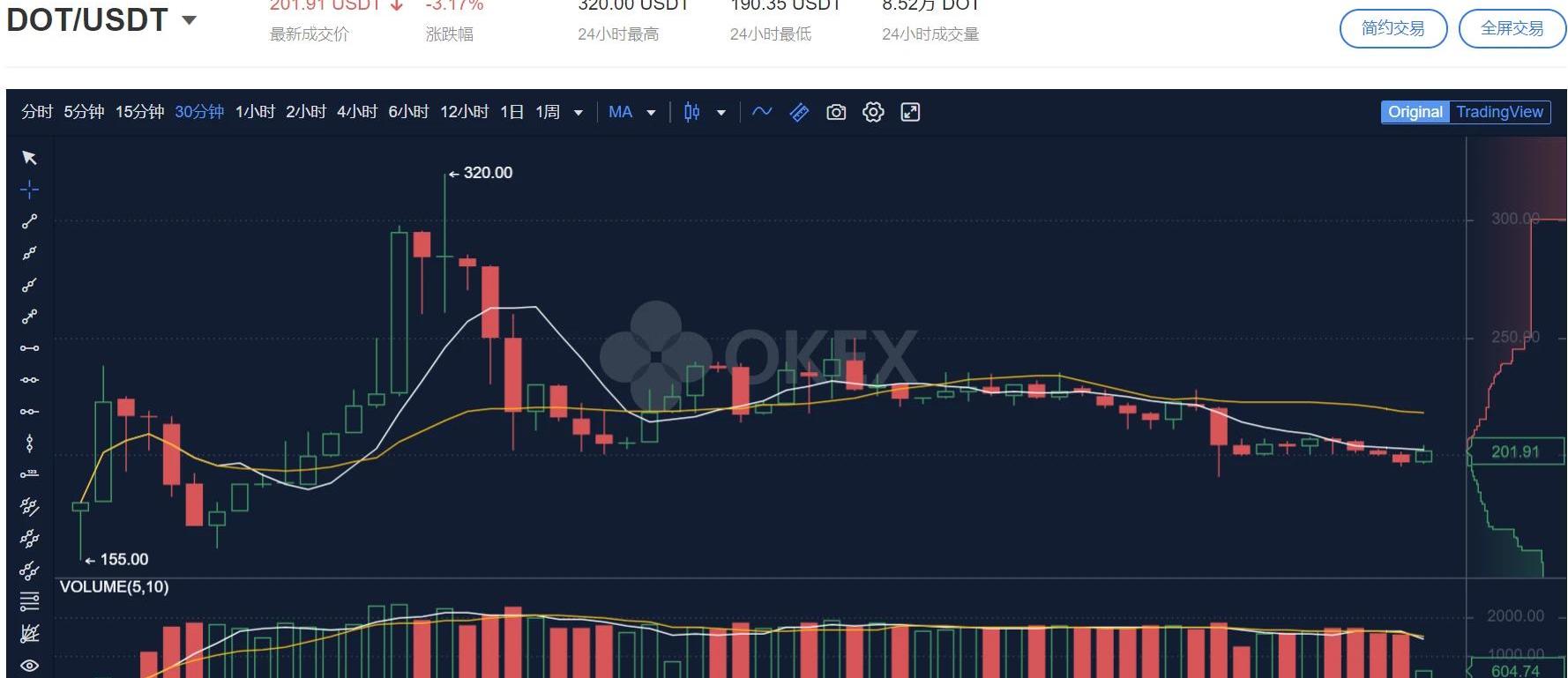 7月17日,DOT在火币、OK的开盘价格分别是121美元和176美元。