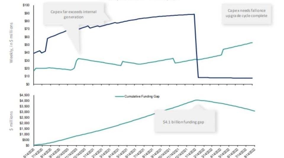 来源:BitOodaestimates,Blockchain.com,Kaiko,Coinmetrics如果BTC价格在两年内以每年40%以上的速度稳步升至19000美元左右,那么,即使以5美分/kWh的电力成本,S19级矿机仍然可以运行,但整个行业的总资本支出与其内部产生的现金流之间,仍存在41亿美元的资金缺口。图:比特币网络的资本支出与其内部产生的现金流,数据截止7/1/2020;Y轴为对数刻度