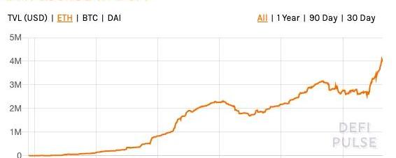 凡此种种,最终都促使ETH需求激增。Defipulse数据显示,过去一个月整个DeFi链上锁定ETH数量激增,从261.8万上涨至408万个,涨幅达到56%,创下新的历史记录。
