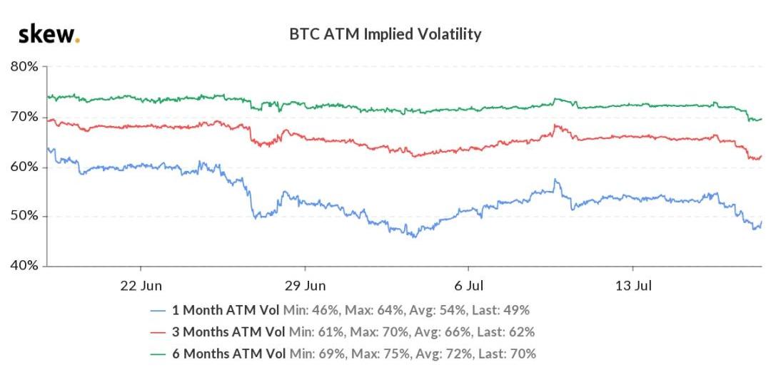 持仓量11亿美元。期权持仓量整体比较平稳。各标准化期限隐含波动率:今日:1m50%,3m63%,6m70%7/18:1m48%,3m62%,6m69%隐含波动率有所回升,周四周五出现IV下跌同时成交量放大,周末IV小幅上升同时成交量下降,已经成为一种规律性的现象。按照这个规律进行操作,买方可以节约1个百分点的成本,加上昨天提到的利用skew进行PCP合成也可以节约1~2个百分点的成本。期权就是这样,一点一点的降低成本的。但是要提到的是,这样操作可能会造成一些择时上的不利。
