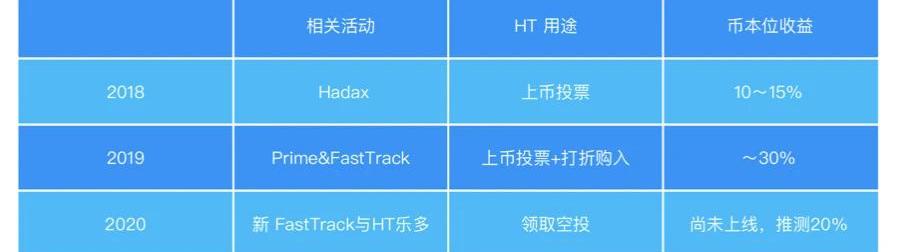 让我们再来分析一下HT的生息面。整体而言,HT的生息面主要来自于火币对它的赋能。无论是最近的活动来看,还是从HT的一贯属性而言,这样的赋能还将长期存在。就目前来说,HT的生息主要来自于四个层面:1.火币推出的各类活动,例如2019年的Prime、2020年的新FastTrack2.火币矿池的HT锁仓挖矿3.未来HT的C2C借贷生息4.未来火币公链的PoS生息首先,先看火币推出的各类年度运营活动。事实上,我们能发现火币每年都会围绕HT举行大规模的活动,我们将它称之为年度活动。如表4-1所示,2018年是Hadex,2019年是Prime和FastTrack,2020年则是全新FastTrack。