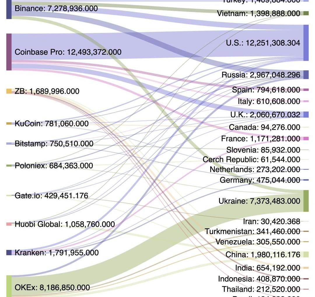 20Q2重点交易所Twitter粉丝数统计,来源:Twitter;TokenInsight6.4用户来源分析“美国、乌克兰、俄罗斯、英国和中国为交易所必争之地TokenInsight对各重点交易所用户来源地区进行分析。数据显示,除美国、乌克兰、俄罗斯、英国和中国外,无其他单一国家或地区可为交易所输出200万量级季度访客。换言之,除上述五国外,其余单一地域市场份额均低于5%。