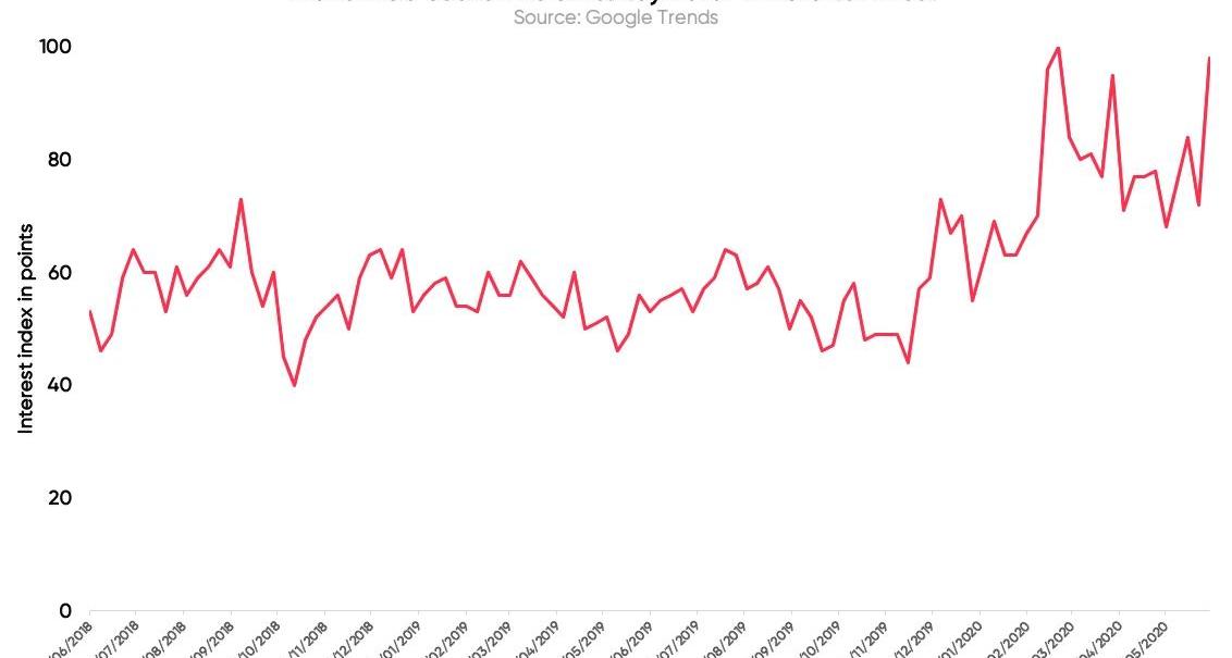 这项调查结果表明,年龄较大的买家对比特币的接受度更高,在疫情大流行期间,老年人的购买率显著上升,几乎与千禧一代和Z一代的月环比增长率持平。而此前,这表明加密技术的应用范围正在扩大。此外,谷歌趋势显示,全球搜索关键词“投资地点”的兴趣明显激增。搜索兴趣指数以100为最高点。过去两年,人们对投资方式的兴趣水平一直在50左右波动。而在疫情期间,该指数在4月、5月和6月急剧上升至75-100水平。