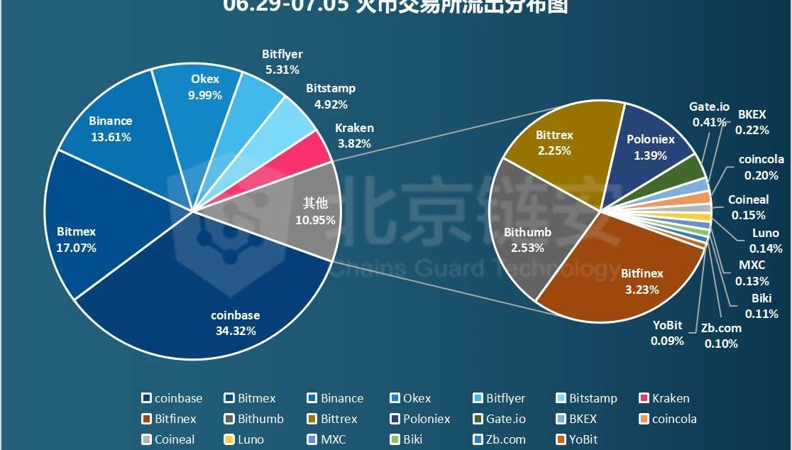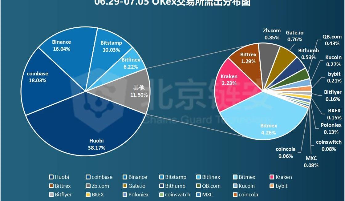 三大交易所流出分布:在过去一周,交易所之间的比特币来往又呈现怎样的分布呢?我们将币安、火币、OKex三大交易所流出到各交易所的比例在这里也向各位呈现。
