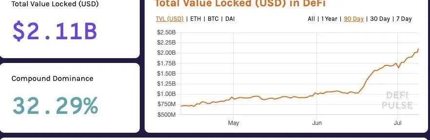 不仅仅是DeFi总市值,DeFi总锁仓也屡创新高。根据defipulse的最新数据显示,以太坊去中心化金融项目的总锁仓值今日已突破了20亿美元,创历史以来的新高。今年2月7号,defipulse博客特意发了篇文章庆祝道:去中心化金融达到了一个新的里程碑,总锁仓超过了10亿美元。它说明了我们正在逐步实现社区对去中心化金融的愿景。短短几个月的时间,以太坊DeFi生态的DeFi总市值,DeFi总锁仓屡创新高,究竟发生了一些什么?这里就不得不谈一谈6月刚发行的明星项目Compund。